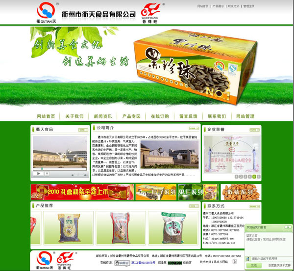 - 衢州市衢天食品有限公司成立于2005年,占地面积35000余平方米。位于美丽富饶的浙江衢州,环境优美、气候宜人、交通便利。企业拥有标准化生产车间和先进的生产线,是一家集生产、销售、商贸配送为一体的综合性企业。本企业自创办以来,始终坚持“质量第一、信誉至上、以诚合作、共谋发展”的指导思想;以市场为向导,以品质求生存,以品牌求发展,以管理求效益的治厂方针;严格按照食品卫生标准指示生产的各种系列产品;同时企业拥有一大批高素质管理人才和专业的营销团队,有成熟的市场网络。