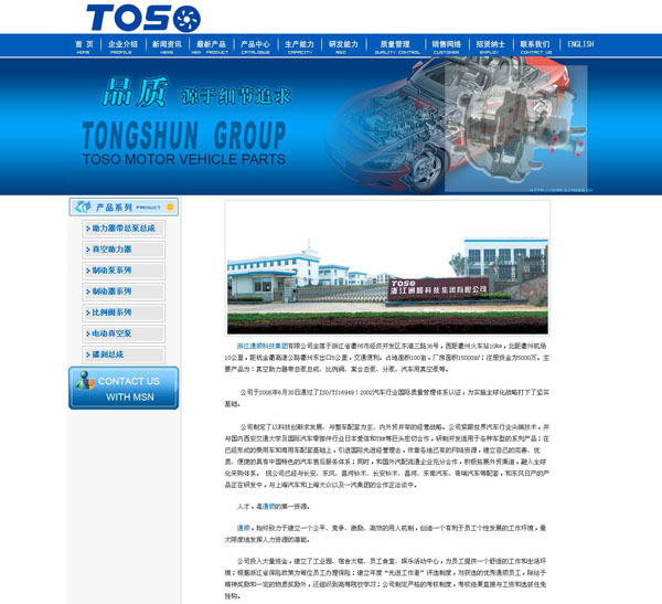 - 浙江通顺科技集团有限公司坐落于浙江省衢州市经济开发区东港三路36号,西距衢州火车站10㎞,北距衢州机场10公里,距杭金衢高速公路衢州东出口5公里,交通便利。占地面积100亩,厂房面积15000㎡;注册资金为5000万。主要产品为:真空助力器带总泵总成、比例阀、离合总泵、分泵、汽车用真空泵等。